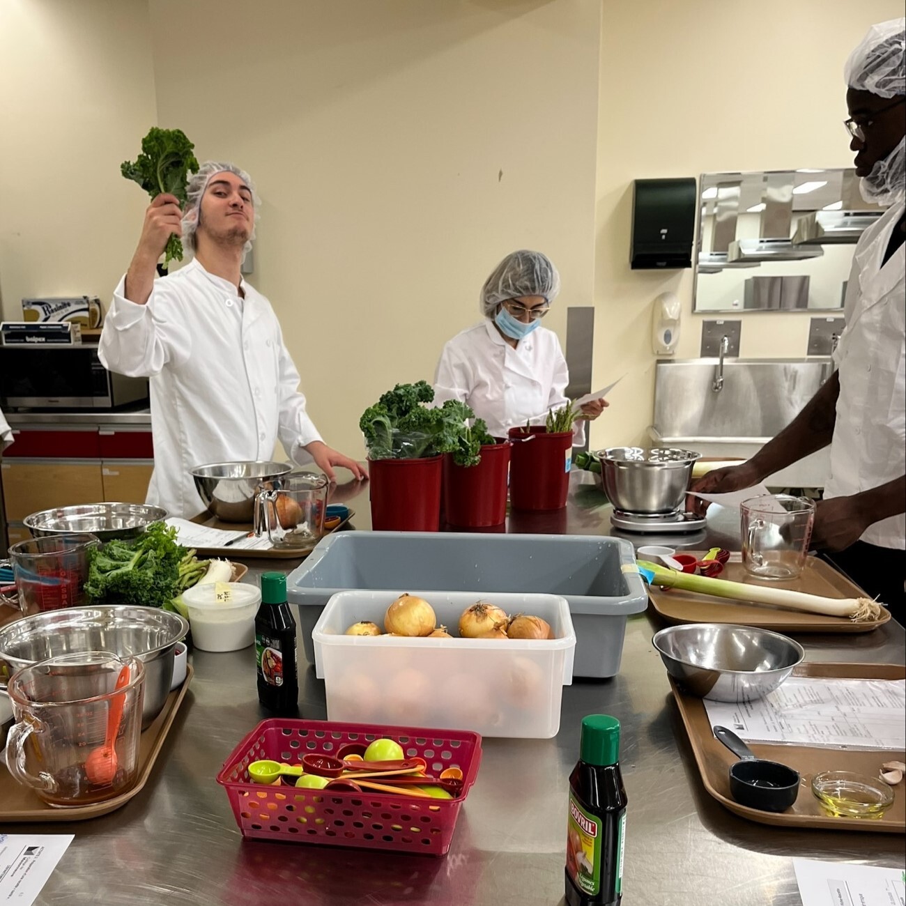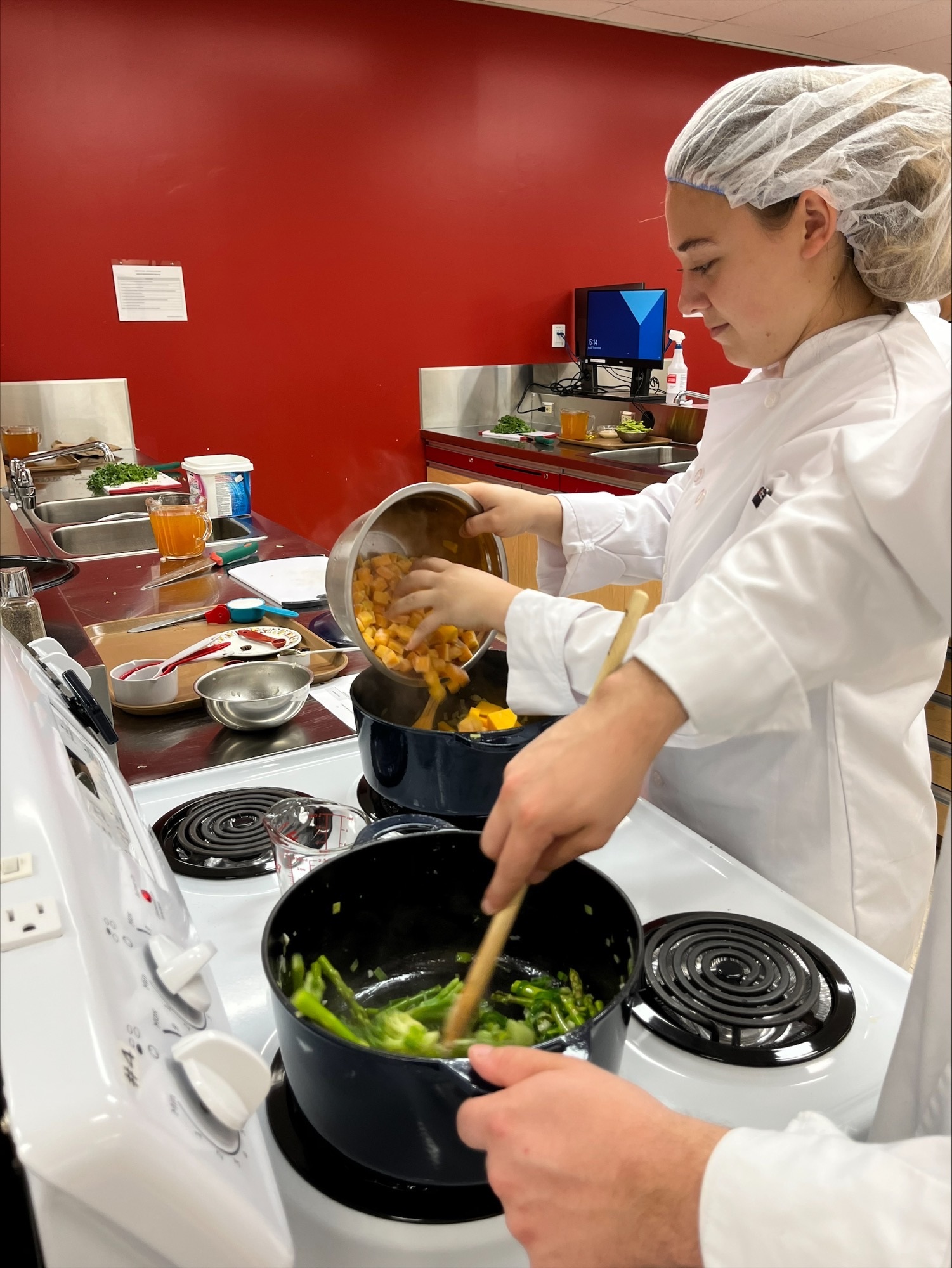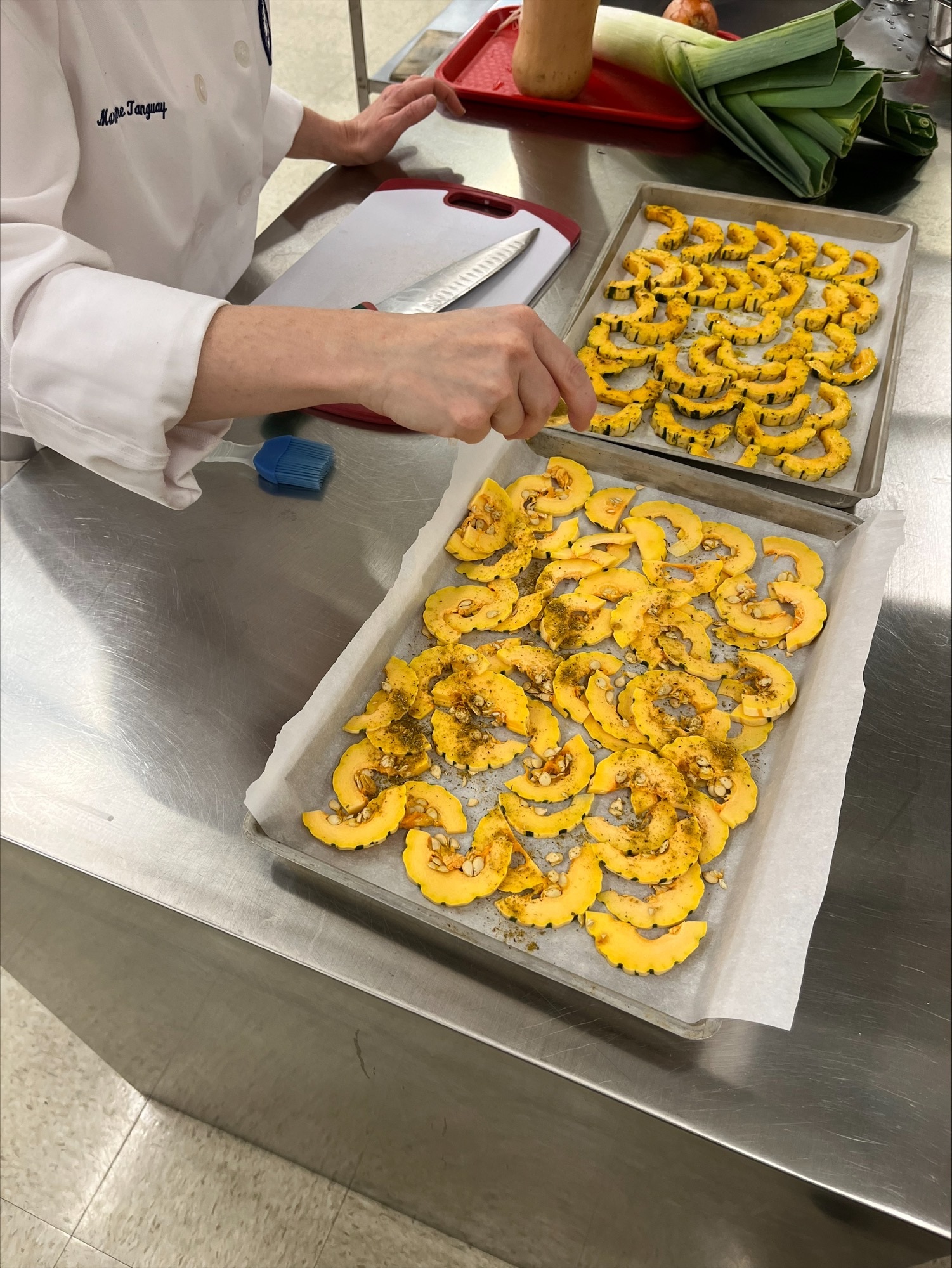Des démonstrations culinaires étaient prévues comme deuxième atelier. Les étudiants ont goûté à la courge Delicata en plus d’apprendre comment cuisiner différents légumes du Québec comme le poireau, la courge et le chou vert. Enfin, les étudiants ont pris part à des ateliers de cuisine collaboratifs où les produits d’ici étaient à l’honneur, créant un potage crémeux à la courge Butternut et un potage au chou vert frisé. Certains ont aussi eu le privilège de cuisiner les pommes du Québec et les bleuets dans un croustillant pommes-bleuets.