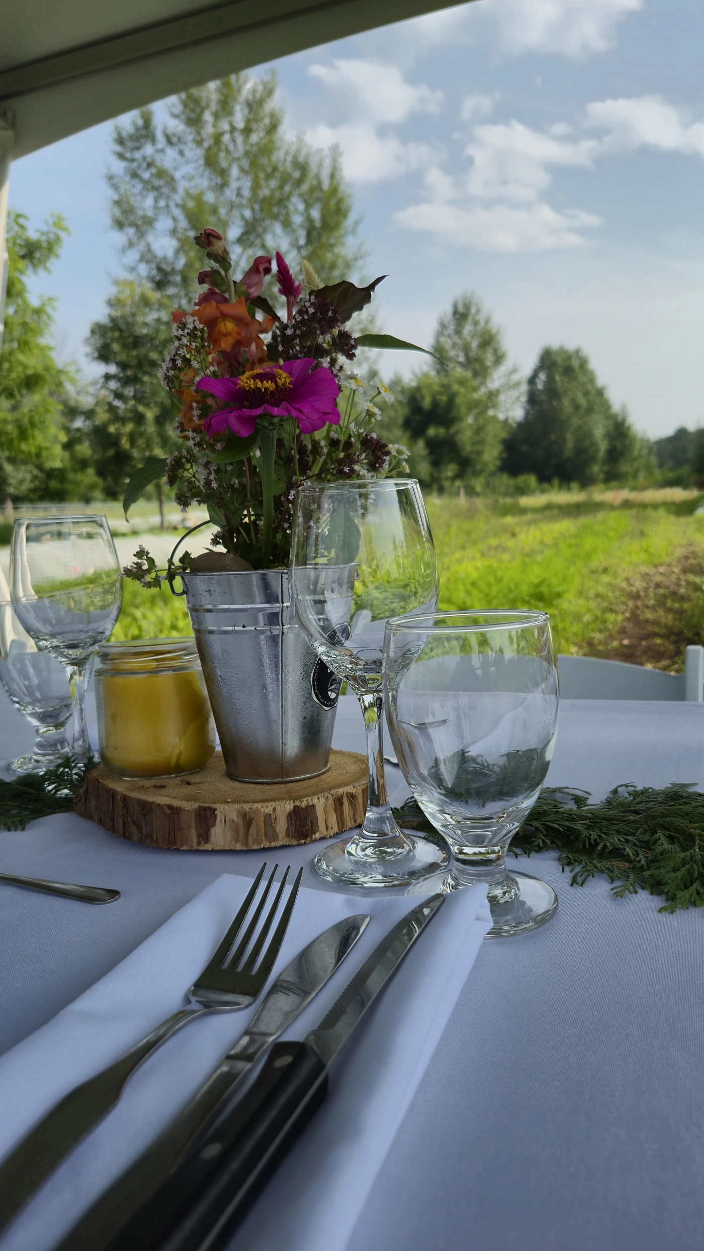 Table champêtre à Pointe-Fortune, la Ferme Les Petites Écores cultive argousier, miel et légumes bio. Les soupers au jardin sous chapiteau mettent en valeur les récoltes de la ferme et des producteurs locaux environnants.