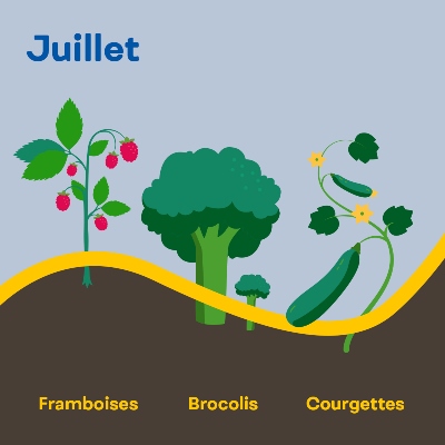Juillet – framboises, brocolis, courgettes, betteraves, chou frisé