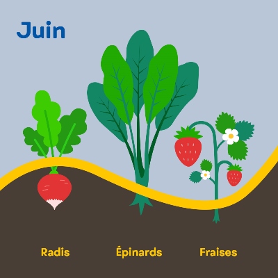 Juin – radis, épinards, fraises, laitue, oignons verts, fines herbes, rhubarbe