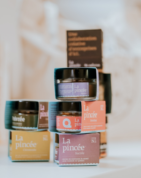 En 2017, nous avons créé une bière de type gruit infusée de notre mélange cari La pincée Bombay Nº11 en collaboration avec Martin L’allier de la micro-brasserie MonsRegius. Par la suite, nous nous sommes associés avec le micro torréfacteur 94 Celsius pour imaginer un surprenant mélange d’épices barbecue au café brésilien fraîchement torréfié. Et c’est en 2020 que nous avons conçu, en collaboration avec l’entreprise Nos Cabanes, notre fameux mélange d’épices barbecue au sucre d’érable du Québec. La rencontre de la créatrice des oeuvres signées Raoul & Simone nous a également inspiré pour créer La pincée de l’Anse. Un mélange d’épices sucré-salé composé de variétés d’algues du Saint-Laurent. Puis avec Julien Fréchette de l’entreprise La Pimenterie, La pincée Pimentée est née. C’est un mélange très relevé dans lequel nous réutilisons la pulpe de piment fermentée vieillit en fûts de chêne pendant 6 mois. C’était pour nous une très belle façon de faire de l’économie circulaire en revalorisant cette délicieuse matière résiduelle. Nous avons travaillé depuis les deux dernières années en association avec Station 22, pour faire la création d’un rhum épicé façon La pincée. Un produit que nous avons pensé et créé ensemble de toute pièce, allant de la recette de macération originale jusqu’à l’élaboration de la marque L'Assemblée. Ce sont des rencontres incroyables qui façonnent véritablement notre histoire.