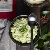 Pour 250 g (approx. 1 tasse) de purée, ajouter 60 g (1/4 tasse) de petits pois congelés cuits, réduit en purée avec un peu de crème. Ajouter à la purée de pommes de terre, ajuster l'assaisonnement et décorer avec des petits pois entiers.