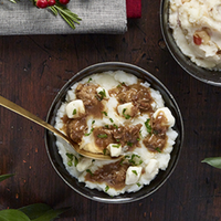 Pour 250 g (approx. 1 tasse) de purée, ajouter 1 à 2 boulettes de ragoût émiettées puis garnir de quelques fromages en grains et d’un peu de sauce à ragoût. Décorer avec du persil frais haché.
