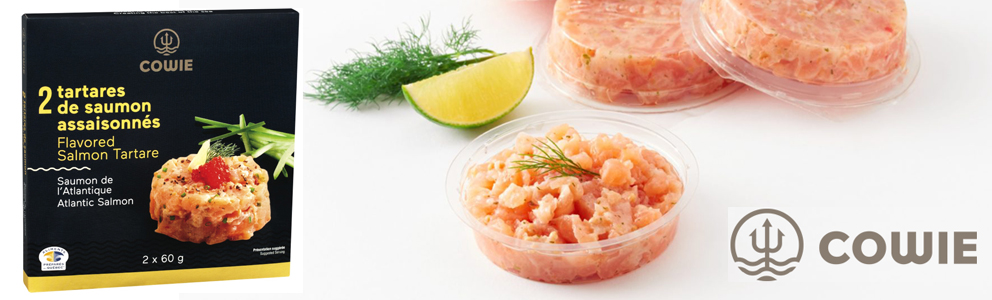 Cowie vous propose en épicerie un paquet de 2 portions de tartare de saumon de l'atlantique, assaisonné et congelé.  Il est préparé avec du caviar de moutarde, du piment, du jalapenos, de l'aneth, du citron et d'autres assaisonemments. Prêt-à-servir, vous pourrez ajouter une petite touche personnelle avec une garniture sur le dessus et des croûtons de baguette.