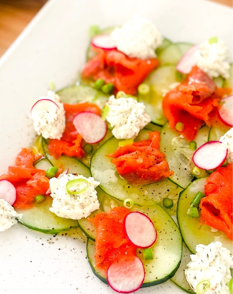 Découvrez une délicieuse recette légère et rafraîchissante mettant en valeur les ingrédients locaux du Québec. Les concombres des champs du Québec, croquants et savoureux, sont accompagnés d'un mélange de saumon fumé ou de truite fumée, de radis frais et d'une touche d'arômes délicats. Pour couronner le tout, une combinaison crémeuse de fromage feta ou de chèvre relevée par des flocons de piment et de l'aneth.