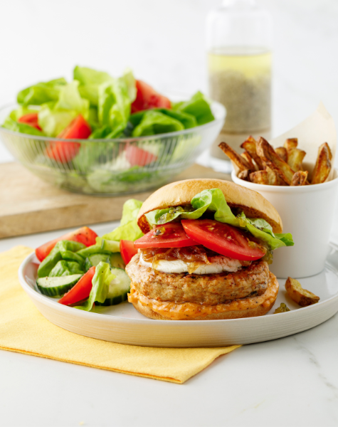 Burger de poulet de grain au fromage de chèvre et oignons caramélisés