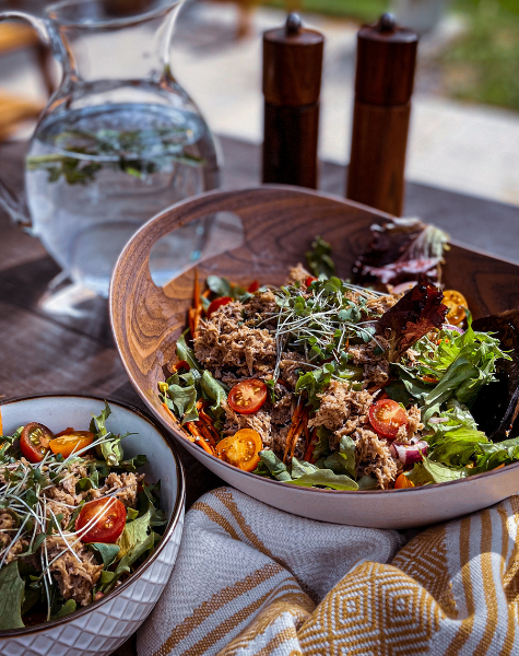 Salade du jardin au canard effiloché présentée par Canards du Lac Brome