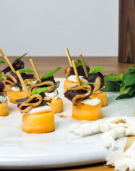 Bouchées de canard fumé, fromage de chèvre et cantaloup présentées par Le Canard Goulu