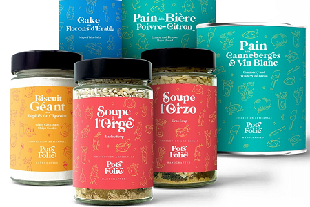 Coup de génie de notre monde en folie, les plats prêts-à-cuisiner de Pots de folie offrent une astucieuse alternative aux plats préparés. Parce qu’on ne dit jamais non à une pause de popote! Empotés avec amour, les Pots de folie sont conçus à partir d’ingrédients secs de qualité, déjà mesurés. Soupes réconfortantes, pains artisanaux, cakes moelleux et desserts décadents comptent parmi les spécialités de la jeune entreprise de Sainte-Julienne. Les curieux et curieuses trouveront les prêts-à-cuisiner de Pots de folie sur les rayons de plusieurs épiceries des grandes régions de Lanaudière et Montréal.